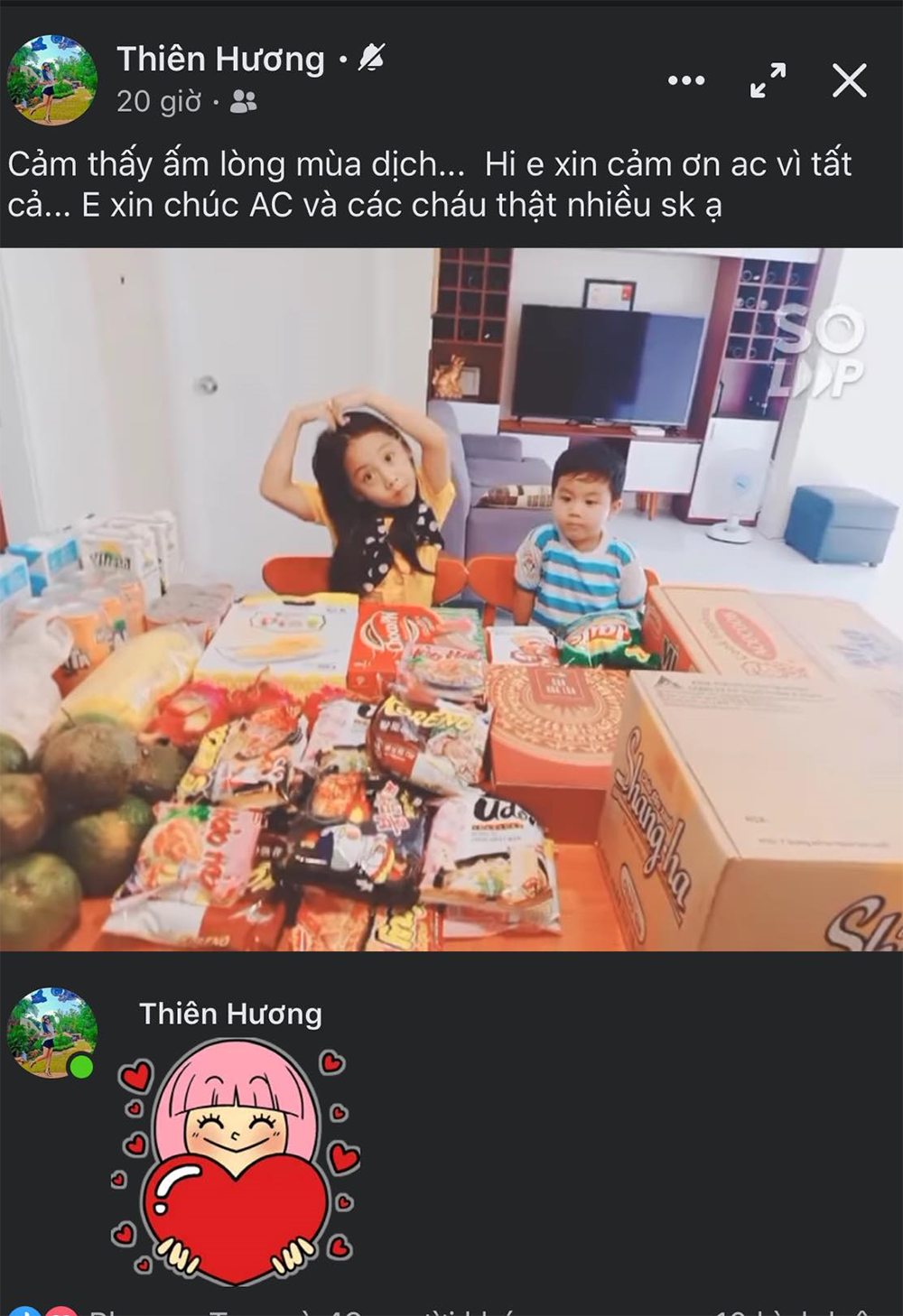 Xúc động vì tình cảm “anh hai” dành cho gia đình mình, vợ đạo diễn Quyền Lộc ghi lại cảnh hai nhóc tỳ cảm ơn “ba Linh” vô cùng dễ thương.